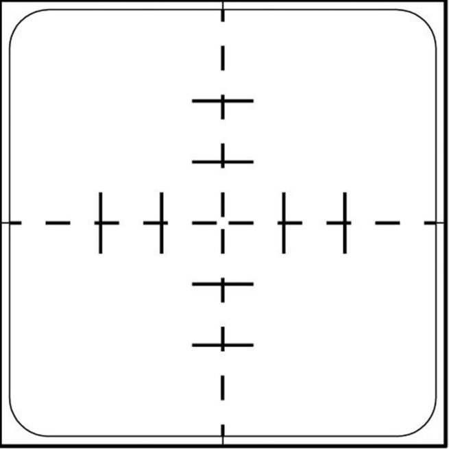 X, Y, and Z: At 1 cm and 2 cm from central axis, 1 cm long dashes