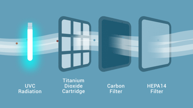 The UVC Air Sterilizer combines UVC light, titanium dioxide, HEPA14 filter, and active carbon. The result is a safer and more pleasant environment with sterilized air. The process destroys the DNA and RNA of bacteria, fungi, and viruses and limits bad odor. Use of the unit is simple. Plug it in, and turn it on. That’s it. Continuous use ensures that airborne germs are minimized.